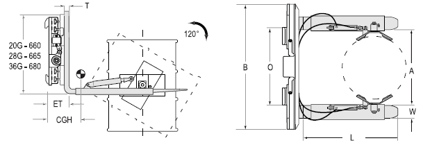 Capacity 承載能力(kg) | Catalog Order NO 型號 | Mounting Class 安裝等級 | Capacity Load Center on forks承載能力@貨叉載荷中心(kg@mm) | Frame Width 框架寬度B(mm) | Opening Range張臂范圍A(mm) | Fork Size貨叉尺寸LxWxT(mm) | Minimum Truck Carriage Width叉車貨叉架寬度最小值O(mm) | Weight 自重(kg) | Effective 失載距ET(mm) | Horizontal Center of Gravity 水平重心CGH(mm) |